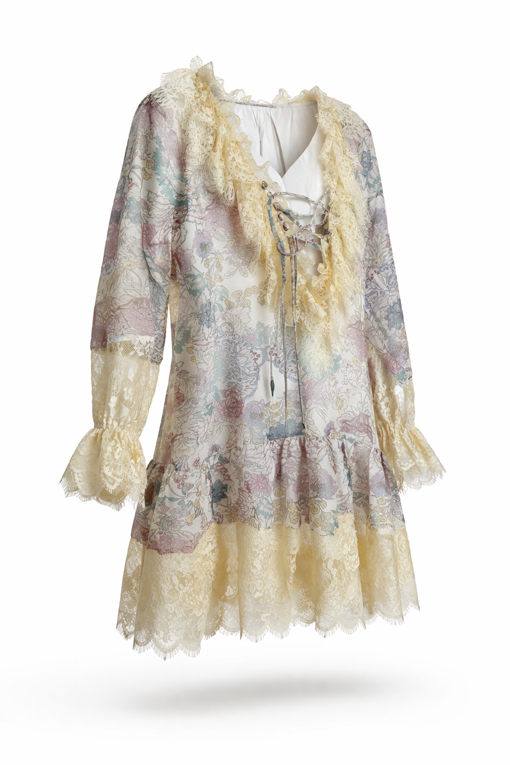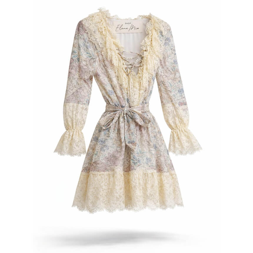 Mini dress in a soft pastel floral print featuring lace trim details.