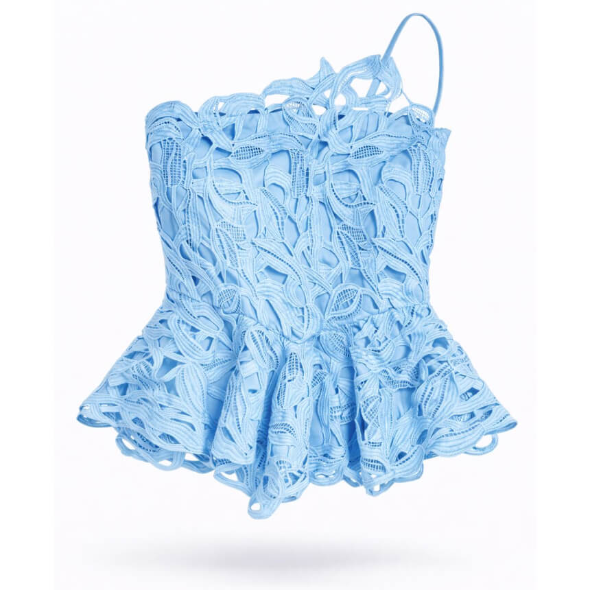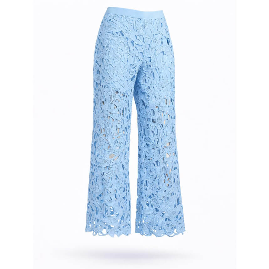 Sky blue set featuring a structured lace top and wide-leg pants.