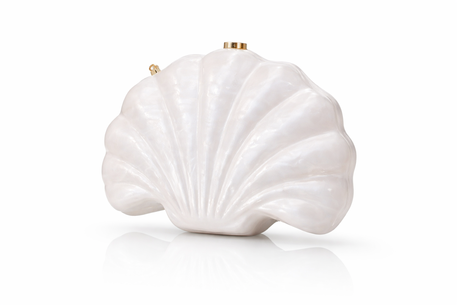 Pearl-effect shell clutch with a sculptural design and gold-tone closure. Elegant, statement, and perfect for special occasions.